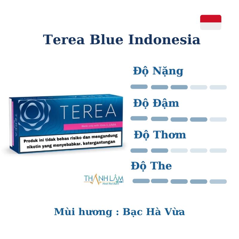 TEREA Blue (Indonesia) mang đến cảm giác làm mát sâu với tinh dầu bạc hà, kết hợp với hỗn hợp thuốc lá êm dịu và được cân bằng bởi chút vị kem ngậy khiến tổng hòa hương vị ở mức vừa phải, không lạnh gắt.